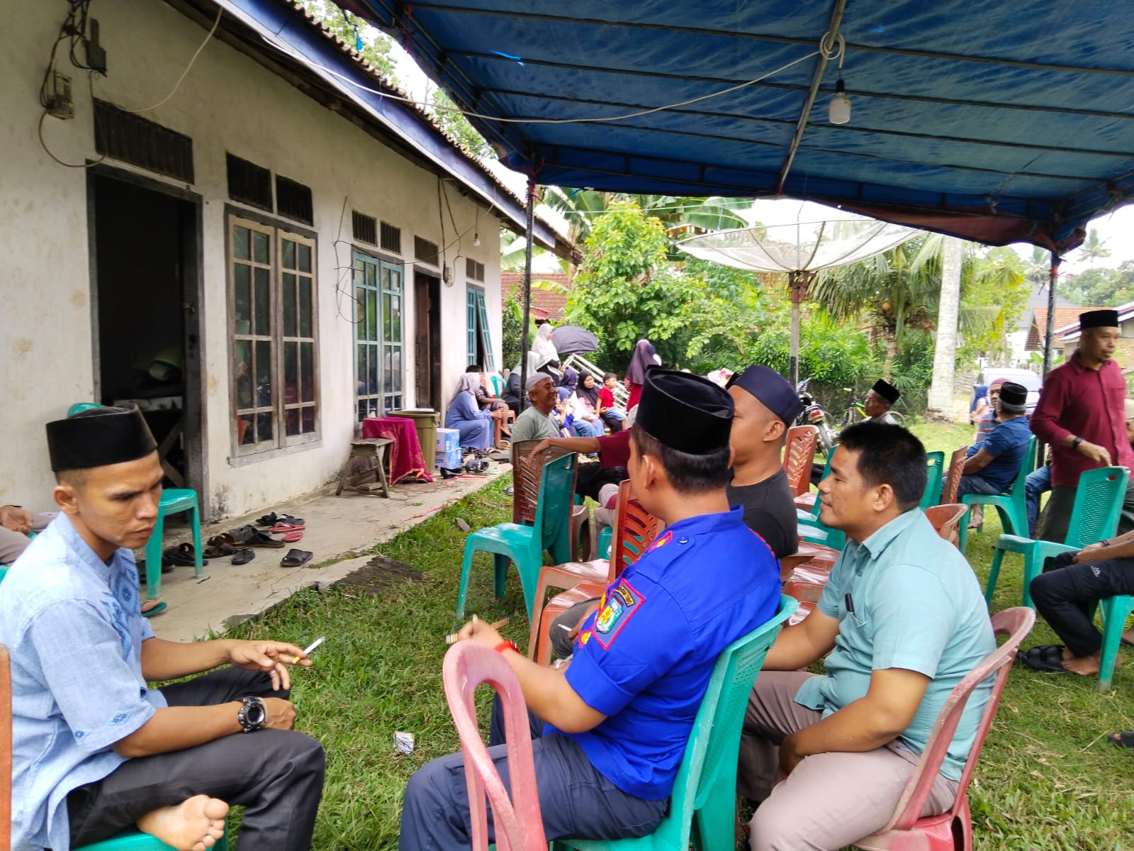 Tampak melayat atau bertakziah di rumah duka almarhum Dedi Iswanto, Kadis Damkar dan Penyelamatan Tebo beserta Staf dan Personilnya, serta Personil Damkar dari Pos Damkar Kecamatan yang ada di Kabupaten Tebo.